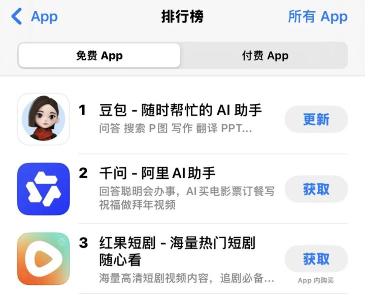从最新App Store免费名次榜看,旧年9月月活就达1.72亿的字节豆包还是排在第一位。它的领跑,源于“时刻+脸色”的双重卡位。