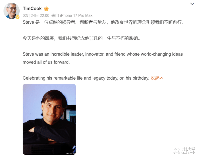 每年苹果已故首创东说念主乔布斯的生日和忌辰,苹果现任掌门东说念主库克王人会发文抒发担心之情。这不,昨天(2月24日)是乔布斯的生日,库克在应答媒体上写说念,“Steve(乔布斯)是一位越过的辅导者、翻新者与知己,他改造宇宙的理念引颈咱们阻挡前行。今天是他的生日,咱们共同顾虑他超卓的一世与不灭的影响。”